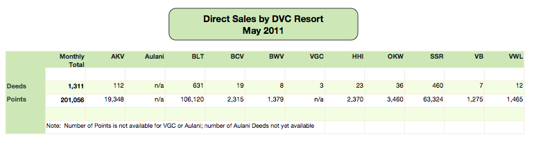 In May 2011, direct sales of Disney Vacation Club points dropped for the second month in a row.