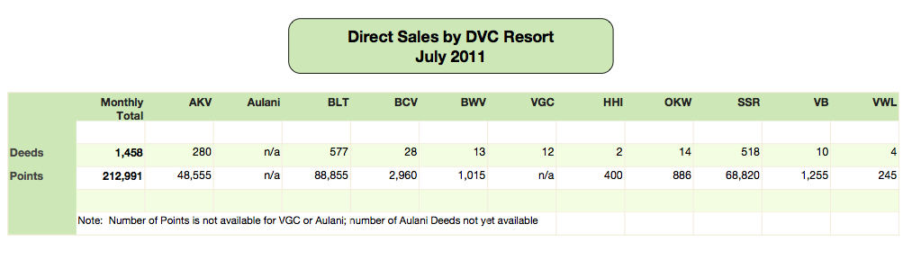 Disney’s Animal Kingdom Villas - In July 2011, Animal Kingdom Villas direct sales apparently benefitted from the decline in sales at Bay Lake Tower. For the month Animal Kingdom Villas sales were up almost 63% to 48,555 points. July 2011 was the third best month in sales for Animal Kingdom Villasin the past year.DVD has sold about 63.7% of Animal Kingdom Villas' 7.4 million points. However, that number does not reflect points that have been reacquired by DVD through foreclosures, Right of First Refusal and other buybacks.
