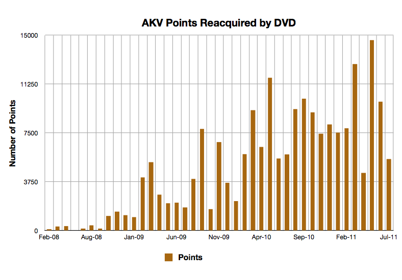 As shown in the chart above DVD began reacquiring Animal Kingdom Villas deeds in February 2008, about 12 months after sales began. Only 5,292 points were reacquired in 2008. But, as time goes on, more opportunities arise for owners to default on their loans or their annual maintenance fees. Thus, the number of foreclosures has also risen. In 2009, the number of reacquired points jumped to 43,107 points, and in 2010 it rose to 91,108 points. Through July 31, 2011, 62,657 points have been reacquired in 2011.