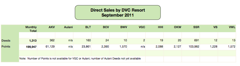 The total number of points sold in September 2011 was 199,947 points, 14.9% less than the previous month. Although Saratoga Springs posted its highest monthly sales in many months, sales for Animal Kingdom Villas and Bay Lake Tower were down 28.0% and 41.6%, respectively, for the month.