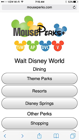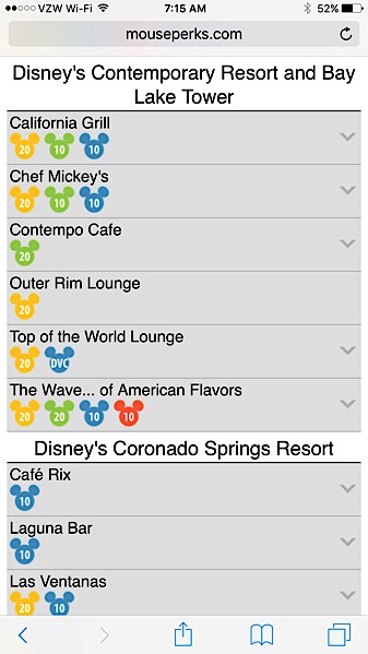 MousePerks.com tracks all of the current discounts offered to Disney Vacation Club members, Annual Passholders, Tables in Wonderland participants and even Disney Visa cardholders. Colorful Mickey head icons are used to identify credentials needed for the discount, with the percent discount listed in the center of the icon.