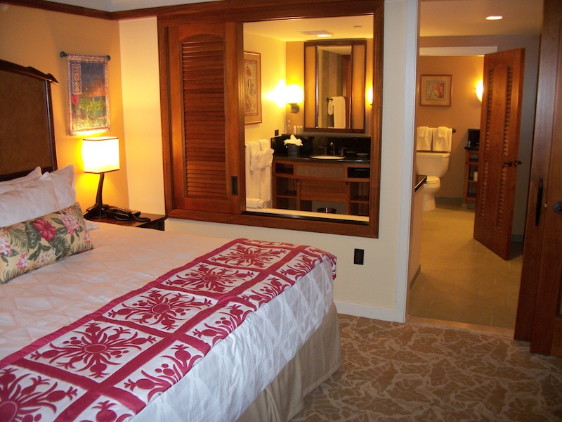 Note some of the Disney touches scattered about the model villa including the Mickey Mouse lamp, Hidden Mickeys in the duvet and the themed artwork. Aulani's one- and two-bedroom villas will have a Murphy bed that folds out from the TV armoire in the living room. This extra sleeping accommodation permits 5 guests to stay in a one-bedroom villa and 9 guests in a two-bedroom villa. Unlike the villas at Kidani Village and the Bay Lake Tower, the Aulani one- and two-bedroom villas do not have the second or third bathroom (respectively.)